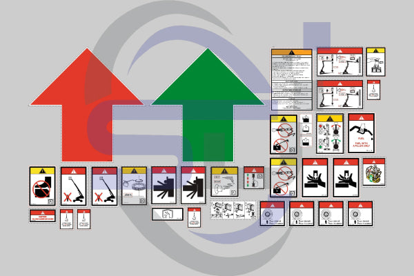 This kit is based on a standard spec machine and only contains the safety decals. This kit does not contain any cosmetic or control panel decals. Please note, before ordering this safety decal kit, it is recommended that you check this sticker kit is the correct one for your machine. Please refer to a parts manual or the table below if you are unsure. We print all our safety decals and signage onto the highest quality UV protected, durable vinyl, to ensure that all decals adhere to your machines and are able to survive harsh environments.